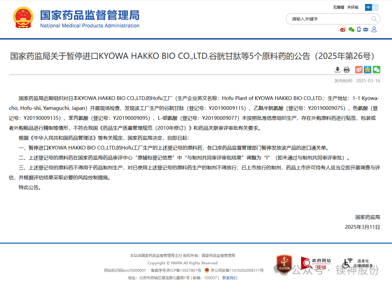 近日,國(guó)家藥監(jiān)局發(fā)布重要公告,宣布暫停進(jìn)口日本KYOWA HAKKO BIO CO.,LTD.(協(xié)和發(fā)酵株式會(huì)社)生產(chǎn)的谷胱甘肽等5個(gè)原料藥。這一決定源于該公司的Hofu工廠在生產(chǎn)過(guò)程中存在未按批準(zhǔn)信息組織生產(chǎn)、外購(gòu)原料藥進(jìn)行貼簽、包裝或外購(gòu)粗品進(jìn)行精制等嚴(yán)重違規(guī)行為,不符合我國(guó)《藥品生產(chǎn)質(zhì)量管理規(guī)范(2010年修訂)》及相關(guān)審評(píng)審批要求。為確保藥品安全與質(zhì)量,國(guó)家藥監(jiān)局已暫停上述原料藥的進(jìn)口,并對(duì)其在藥品制劑中的使用進(jìn)行了嚴(yán)格限制。